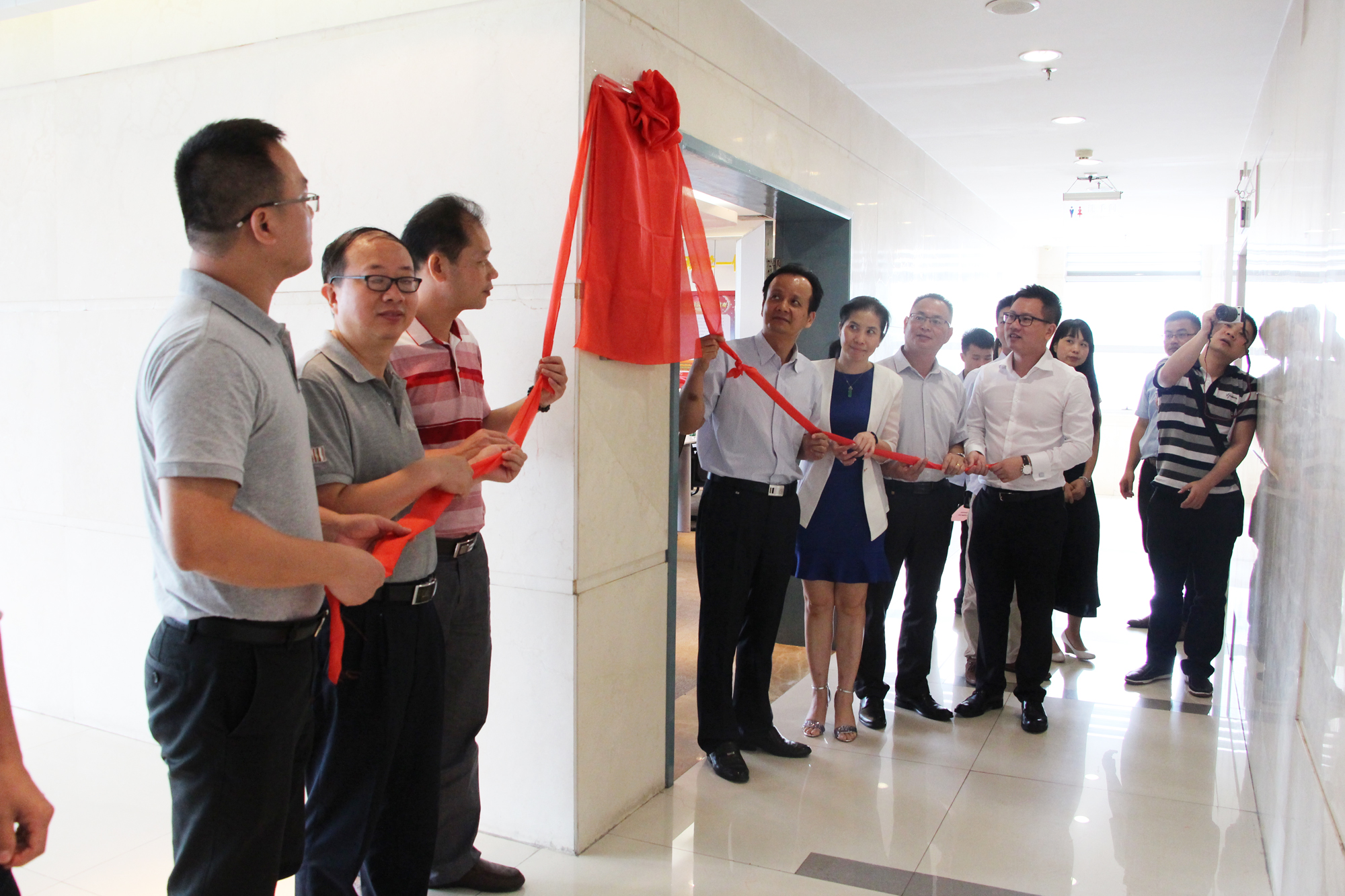 在全体党员的见证下,黄主任与集团党委领导共同为党建活动室揭牌并合影留念。