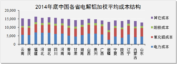 从区域电解铝生产成本结构上看,2014年云南地区氧化铝成本位于全国最低位,占比为27.1%;重庆次之,占比为28.2%。值得关注的是,福建地区氧化铝成本占比为29.4%,但电解铝加权平均成本位居全国最高位,主要原因是福建地区电力成本处于全国最高水平,电力成本占比高达43.2%。