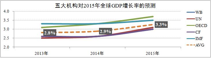发稿时间:2015-04-11根据世界银行(World Bank)、联合国(United Nations)、经济合作与发展组织(OECD)、英国共识公司(Consensus Forecasts)及国际货币基金组织(IMF)等五大国际权威机构的预测,2015年全球经济形势整体好于2014年,下半年全球经济增速将会有较为显著的回升,其中主要得益于全球贸易的逐步增长、通货膨胀及失业率的继续走低,预计全年全球GDP加权平均增速为3.3%,较2014年提升0.4个百分点。