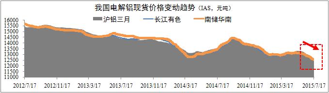 发稿时间:2015-07-18电解铝现货价格继续回落。监控数据显示,7月上旬电解铝现货价格继续保持下滑趋势,且下滑幅度有所扩大。截至7月17日,长江有色现货价格跌至12503元/吨,南储华南跌至12543元/吨,月化日均跌幅分别为0.14%和0.15%,同比分别扩大0.03和0.05个百分点。从数据分布上看,目前现货价格与沪铝三月期货价格之间的差值已收窄至100元左右,预计该趋势将进一步延续。