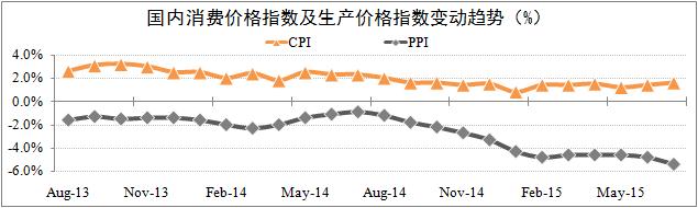 通货紧缩预期增强。截至7月份,国内价格总水平运行依然偏弱,以消费价格指数(CPI)和生产价格指数(PPI)为主的经济面出现“剪刀差”现象。数据显示,7月份CPI环比上涨0.3%,同比上涨1.6%;PPI环比下降0.7%,同比下降5.4%。其中PPI已连续41个月出现负增长,且幅度逐月扩大。CPI与PPI增幅差距的进一步扩大强化了国内通货紧缩预期,宏观经济增长风险加大。