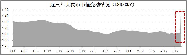 人民币技术性贬值。央行于8月11日调整人民币汇率中间价报价机制。截至8月20日,美元兑人民币汇率上升至6.4,为近三年来的高点,人民币出现贬值现象。其中,较8月10日贬值4.6%,较8月11日贬值2.7%。此次人民币贬值属于技术操作层面问题,主要目的在于消除人民币中间价与市场汇率之间的偏差,为应对9月份美联储加息造成的系统性贬值做好准备。