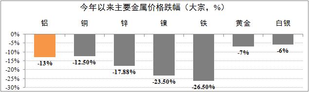 大宗商品价格走低。今年以来,全球大宗商品价格出现显著下跌现象,并引起近期大宗商品的抛售潮。有色金属全线溃退,其中,铝价下跌13%、铜价下跌12.5%。大宗商品价格走低暗示着全球经济增长动能相对缺失,综合分析成因,主要包括以下三点:一是大宗商品总体处于供过于求的状态;二是美元走强,9月份加息预期增强;三是新兴市场经济体增长疲软。