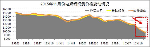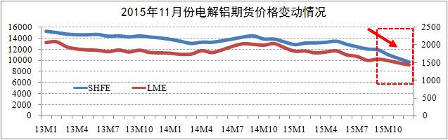 期货市场方面:截至11月24日,沪铝三月结算跌至9670元,自跌破万元大关以来,沪铝主力合约日均涨跌幅为1.4%-2.1%;LME铝三月结算跌至1446美元,其跌幅自今年8月以来开始低于沪铝跌幅。研究认为,沪铝三月与LME铝三月结算价将逐步筑底于9600元关口(Min.值),期铝价格将迎来较大的反弹空间。