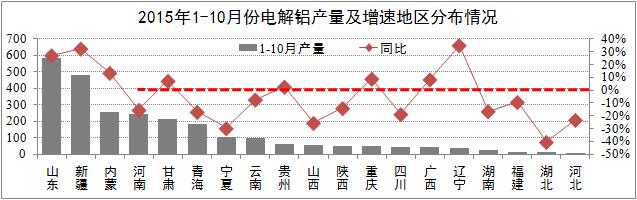 发稿时间:2015-12-09市场供给方面:产能方面,10月全国电解铝建成产能约3800万吨,运行产能3086万吨,开工率为81.3%;产量方面,10月电解铝产量259万吨,同比增长9.8%,累计同比增长4.8%,其中:山东、新疆、内蒙、河南等省份全国产量占比65%。截至11月18日,电解铝合计减产389万吨,占国内总产能的10.3%,其影响效果将于2016年第二季度得到体现。