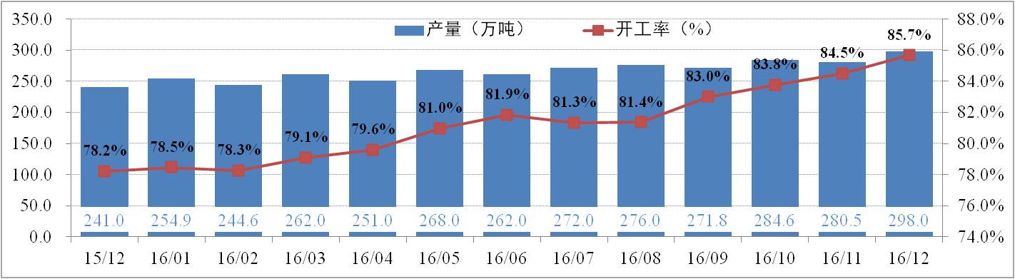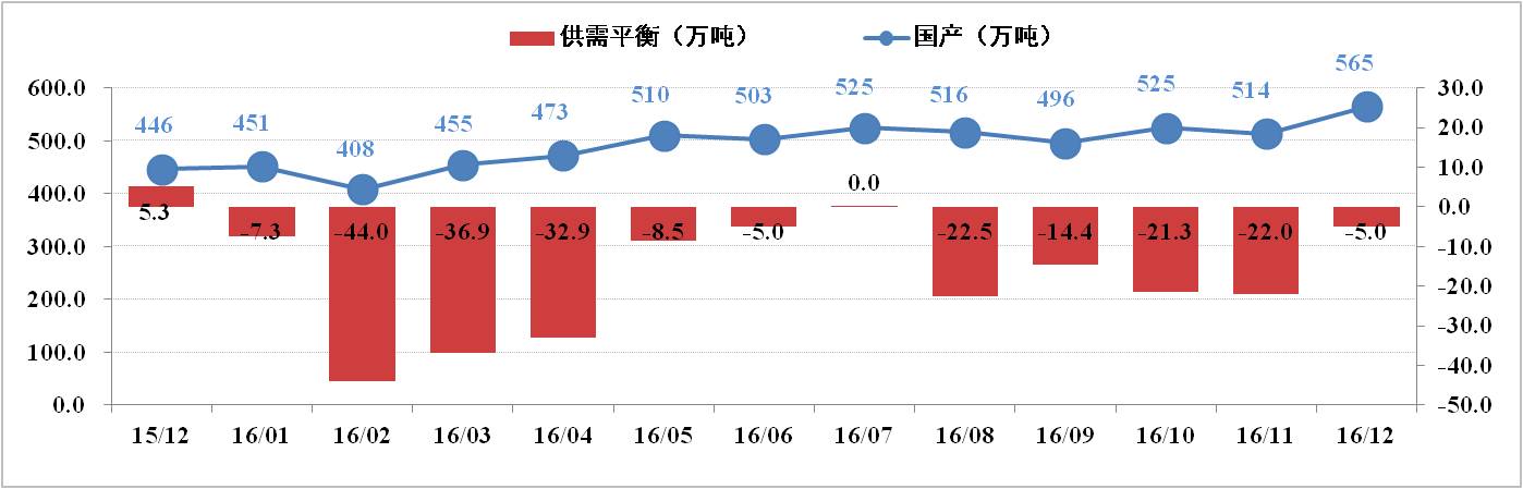 供给方面:12月份全国电解铝有效产能为4,219.5万吨,运行产能3,615.3万吨,开工率为85.68%。其中,12月份电解铝总产量为294.2万吨,日化产量9.49万吨,供应持续增加。调研数据显示,2016年国内电解铝已累计减产88.4万吨;累计复产242.55万吨,待复产约60万吨;新产能已投产393.8万吨,待投产71万吨。