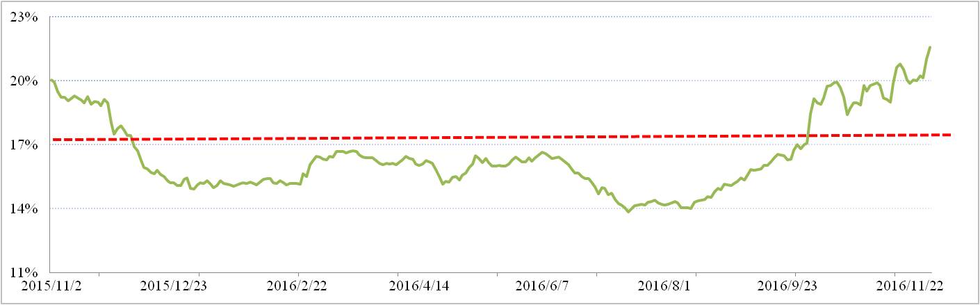 沪铝三月比例价方面,11月沪铝三月合约下行趋势明显,月末加权平均价报收于13,118元/吨。若按17.6%氧化铝作价比例,2017年1月份全国氧化铝长单加权价格为2,309元/吨,与现货加权价格的价差扩大到646元/吨。12月份期铝全国氧化铝现货加权价与沪铝三月加权平均价实际折算比例为22.95%。