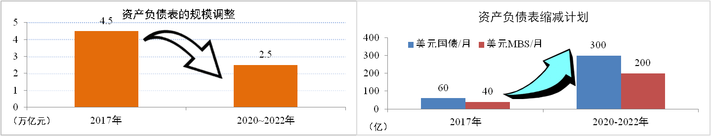 美联储6月15日议息会议表示计划年内开始缩减资产负债表规模,预计用3-5年时间逐步减少到期证券的本金再投资规模,将资产负债表规模从4.5万亿美元缩减至2~2.5万亿美元。具体方式:起初每月缩减60亿美元国债、40亿美元MBS;规模每季度增加一次,直到达到每月缩减300亿美元国债、200亿美元MBS为止。