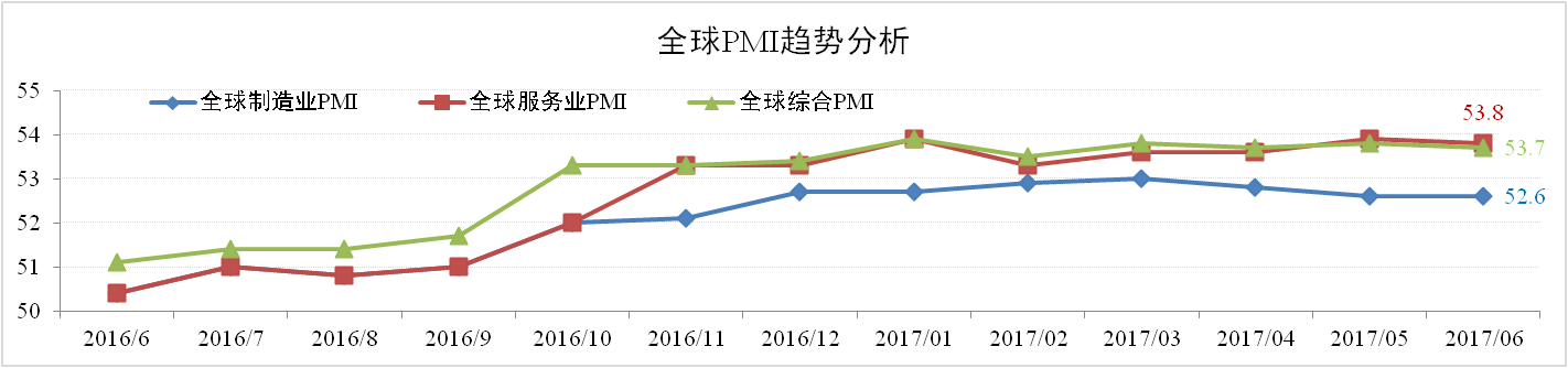 2017年以来,全球经济延续复苏态势。据市场调研机构IHS Markit与摩根联合发布的全球PMI数据显示,6月全球制造业、服务业以及综合PMI指数分别为53.8、53.7以及52.6,均处于扩张区间。同时6月亚太经合组织将2017年全球经济增速预测由此前的3.3%调高至3.5%。