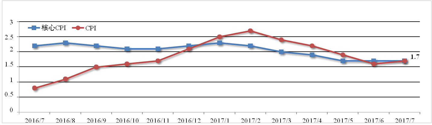 7月美国CPI同比为1.7%,较上月上升0.1个百分点,不及预期的1.8%,核 心CPI同比亦增长1.7%。其中住房支出成本与电信服务费用疲软是导致美国核 心CPI走弱的最主要原因。