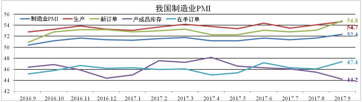 9月份我国官方制造业PMI为52.4,创下自2012年5月以来最高点。分项中, 在手订单、新订单分别扩大1.3、1.7个百分点至47.4以及54.8,产成品库存缩小 1.3个百分点至44.2,生产上升0.6个百分点至54.7。