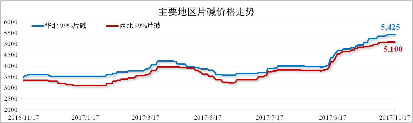 10月片碱库存水平保持低位,片碱企业预售11月订单,导致片碱报价维持高位。截至11月17日,华北地区99%片碱报价5,425元/吨,环比上涨11%;西北地区99%片碱报价5,100元/吨,环比上涨6% 。