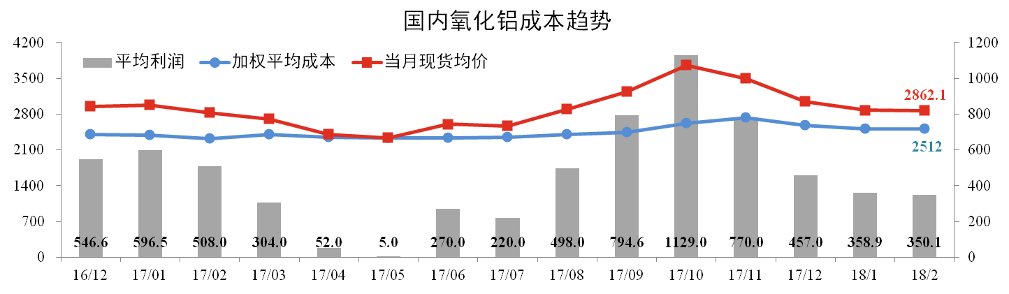 2月份国内氧化铝加权平均成本为2,512元/吨,环比下跌0.12个百分点。当月全国氧化铝现货成交均价为2,862.1元/吨,较上月下跌0.41%。理论上,氧化铝行业平均利润水平为350.1元/吨。