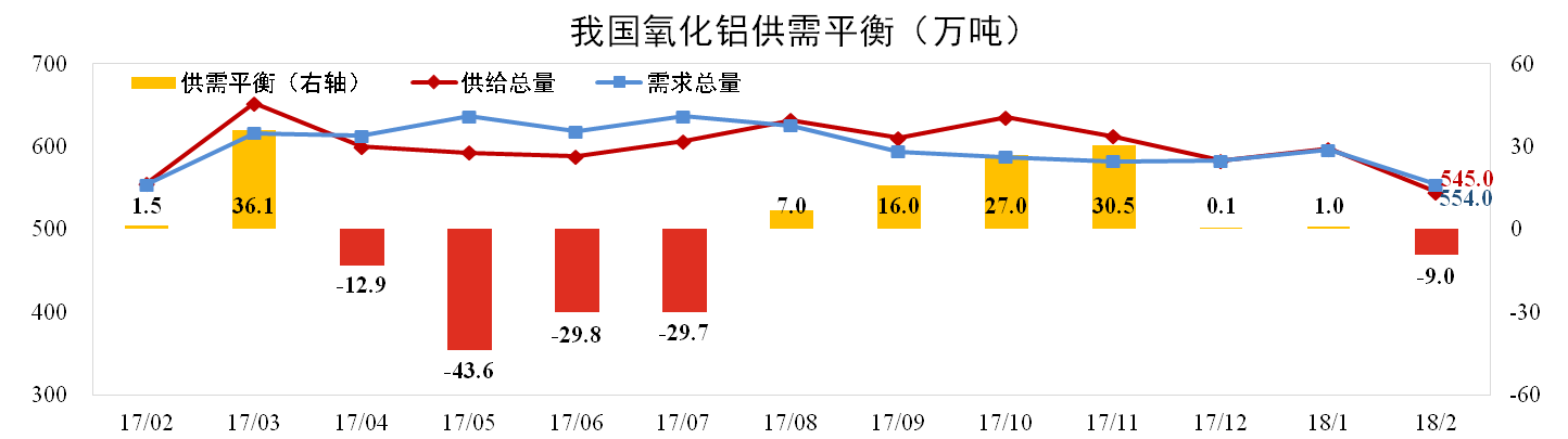 发稿时间:2018-03-23一、氧化铝供需小幅短缺