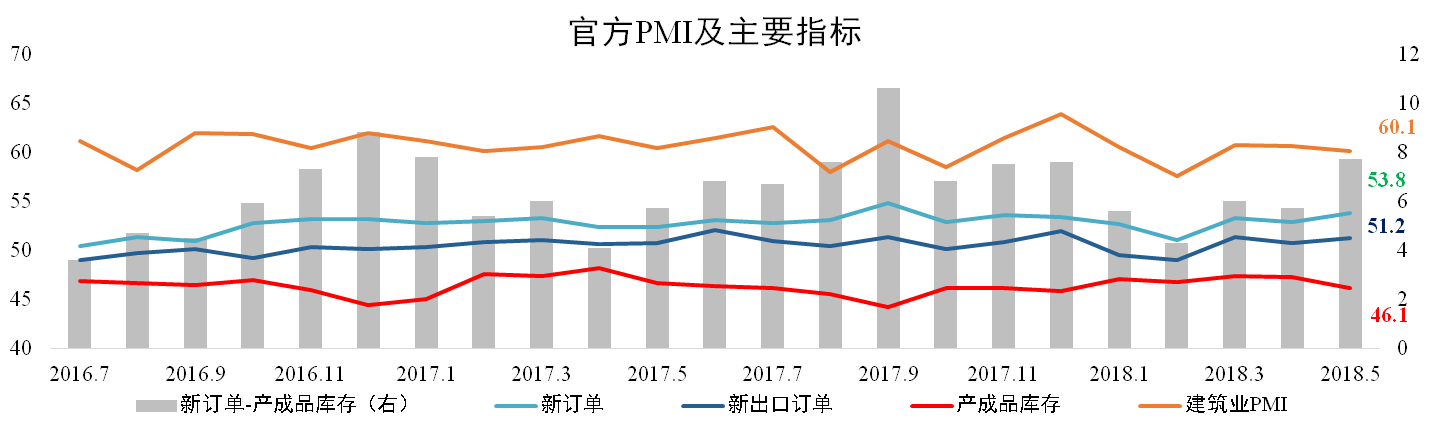 5月份产成品库存为46.1点,较4月下降0.9个百分点;新订单为53.8点,较上月上升0.5个百分点,其中新出口订单为51.2,较上月上升0.5个百分点。建筑业PMI延续下滑走势,较4月下滑0.5个百分点至60.1点。