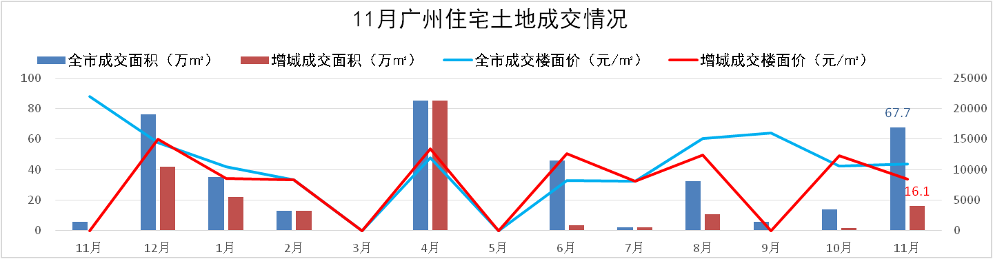 11月广州市共推出26宗地块,分别为25块住宅用地和1块商业用地,推出面积216.4万㎡。商住用地共成交12宗,成交面积74.7万㎡,成交楼面价10045元/㎡。
