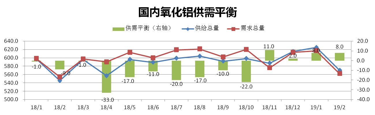 分析认为:2月矿石供应逐渐稳定,氧化铝产量有所下降,下游需求仍旧疲软,氧化铝供给过剩。2月氧化铝价格仍处于低位,部分企业将出现适度减产,但因需求下滑,氧化铝仍旧供过于求。