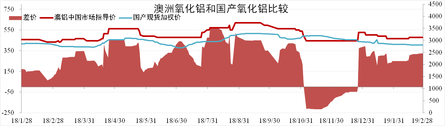 分析认为:2月受国内氧化铝价格回落影响,与进口氧化铝价格差倒挂结束。2月国产氧化铝价格持续回落,澳铝中国市场指导价波动较小,预计进口氧化铝价差缓慢拉大。