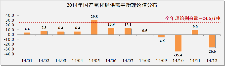 供给方面。2014年度全国氧化铝建成产能6375万吨/年,运行产能5598万吨/年,同比增长3.7%,开工率87.8%。据统计局数据,2014年总产量为4777万吨,环比增长7.1%。综合分析我国氧化铝市场的供需情况,理论上国产氧化铝全年供给剩余量为24.6万吨,加上528万吨的进口供给,我国全年氧化铝市场供给理论剩余总量约553万吨。从供需平衡的角度上看,国内氧化铝市场供给相对饱和的现状是导致氧化铝市场价格逐步回落的客观原因。综合考虑运输因素,预计内陆地区的国产氧化铝市场仍将具有较强的竞争力。