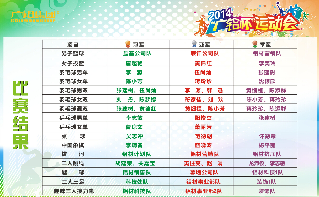 本届运动会共设置比赛项目10个大项,16个小项,报名参加人数达462人。同时,组委会还在上一届运动会的基础上,增加了趣味三人接力跑比赛、羽毛球双打、毽球竞技等比赛项目。在历时三周的比赛中,各参赛选手充分展示了自己的体育特长,体现了一种奋勇拼搏、积极向上的精神风貌,并取得了良好的比赛成绩。最终在篮球、羽毛球、乒乓球、桌球、拔河、象棋等10项赛事中产生出冠、亚、季军共47人次。本届运动会无论是赛事赛程,还是获奖人次,规模和水准均得到了一定的提升。